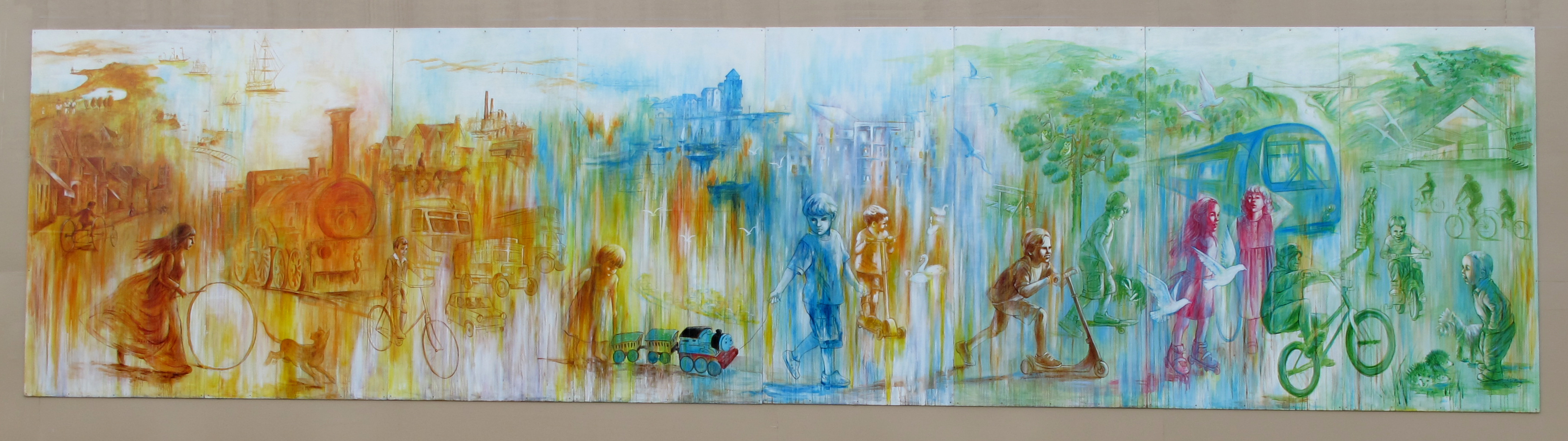The mural embodies images from the past, present and future of Portishead and the surrounding area. Included are: the first train to Portishead in 1867, the High Street in 1890, a 1909 horse carriage, a diesel railcar from 1954, the modern marina, and a future train and station. Aili drew inspiration for this type of painting from rock paintings and murals she visited in China. Explore mural detail ... |