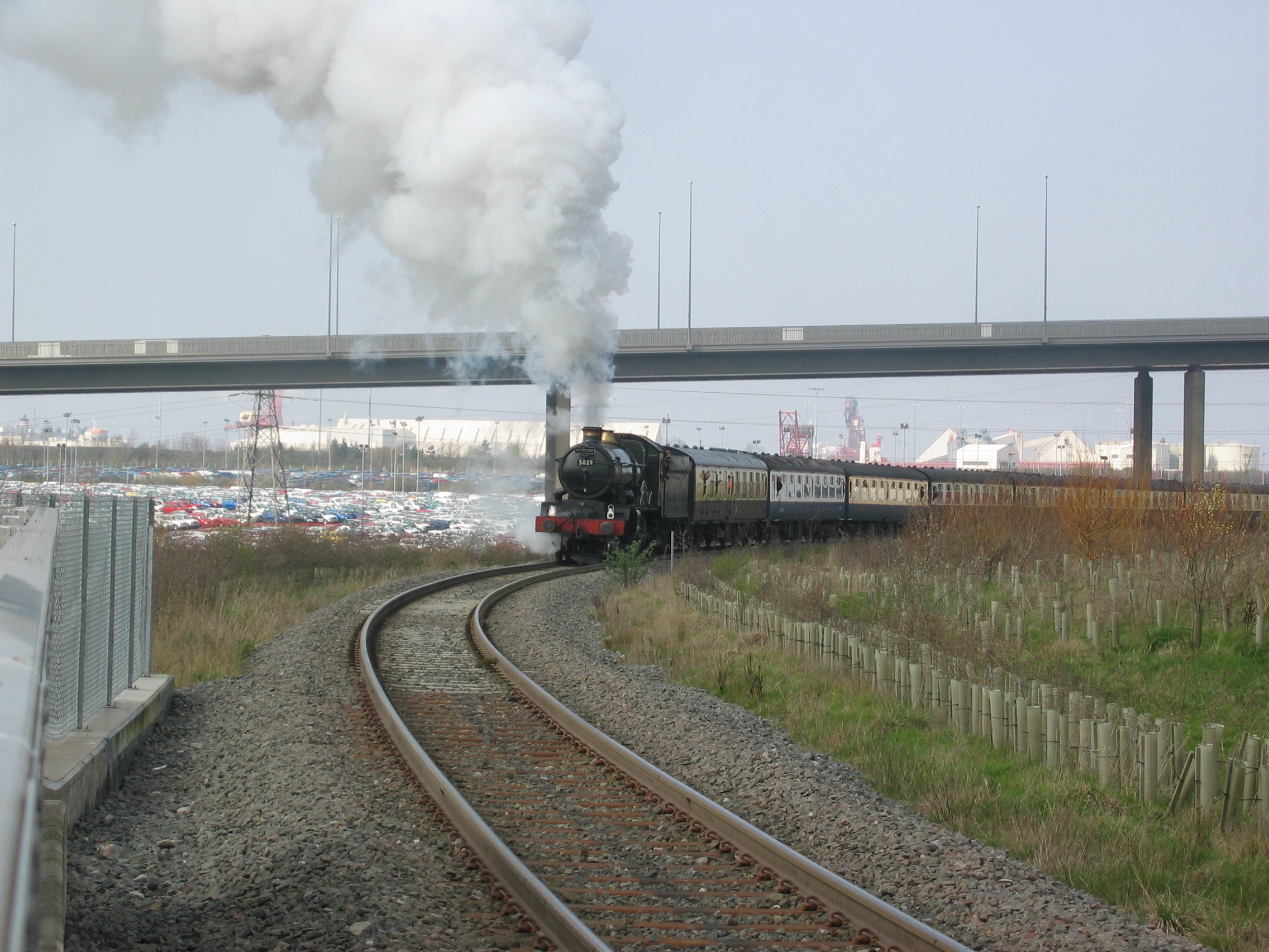 Steam excursion on Easter Monday 28 March 2005. Nunney Castle coming from Royal Portbury Docks under M5 bridge. |