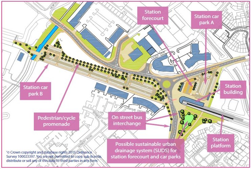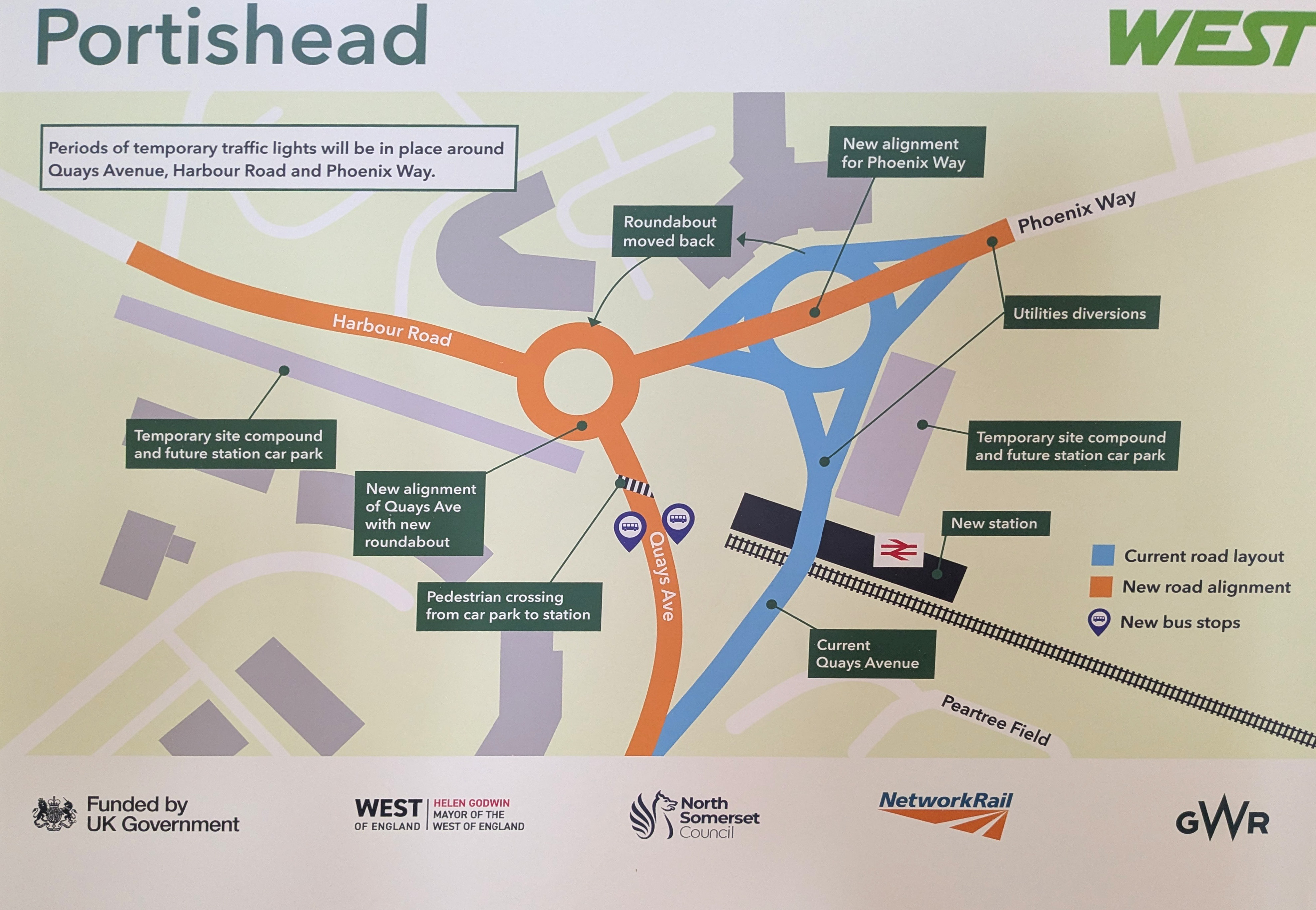 The map above shows the site of the new Portishead station. The roundabout has been moved about 75m to the left(west) of its current location. Note that there could be detailed changes to this layout. Click map to enlarge |